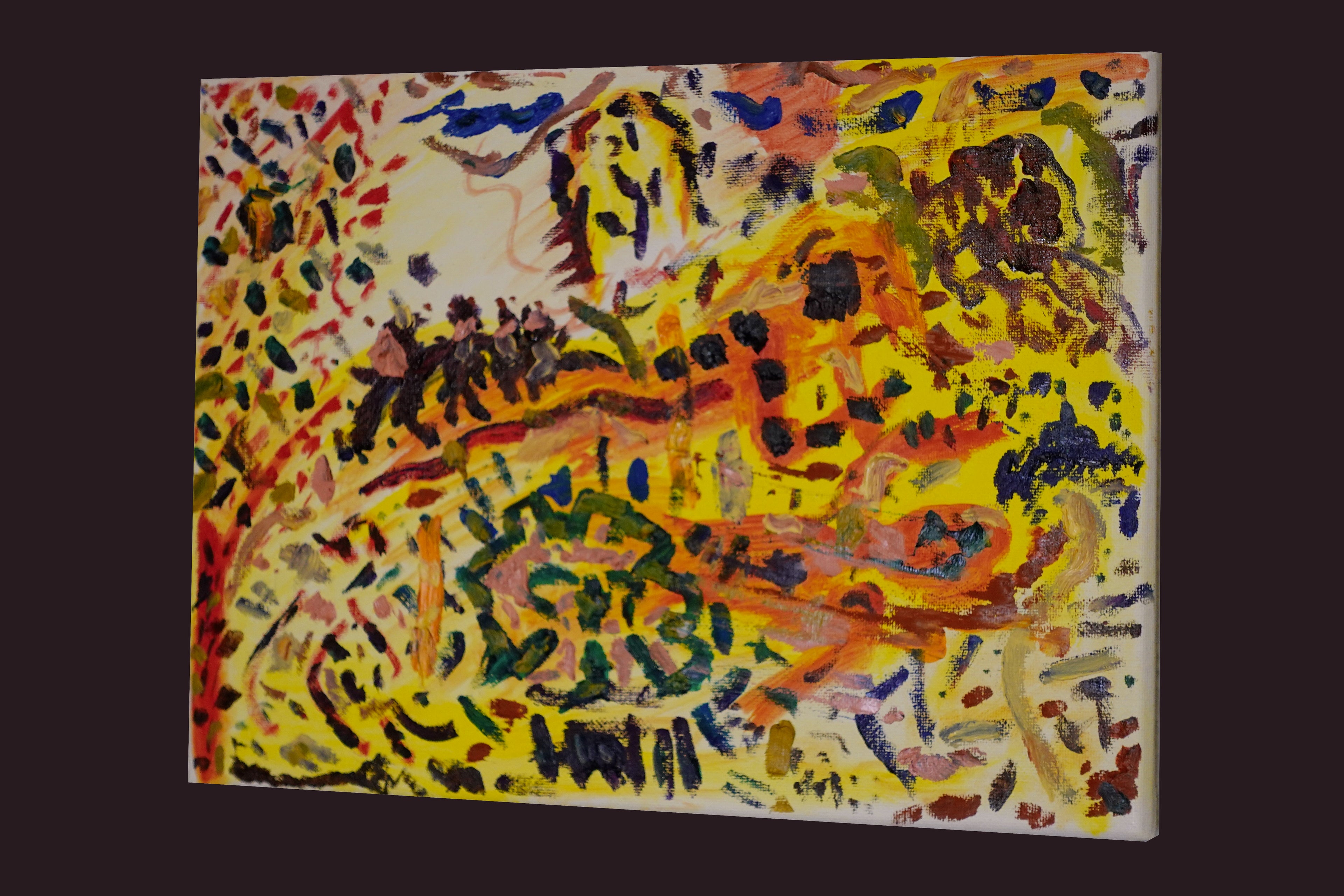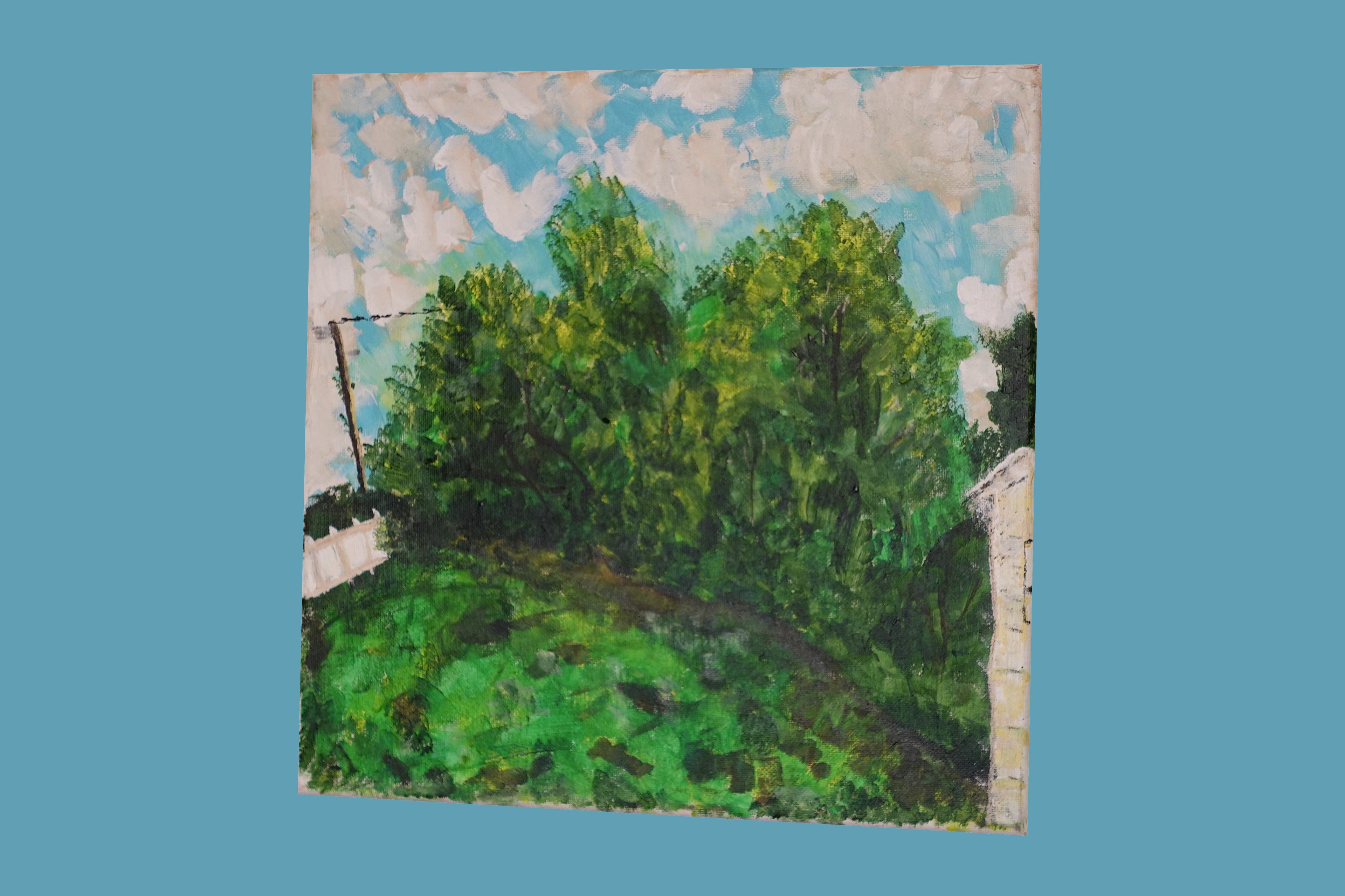 This was started when we first moved here and we didnt even have a desk in the house. I revisited it in the spring of 2025 while we were at the park. I just woke up and finished watching a Basquiat documentary and he bled through the art again. I was attempting to paint a few trees I saw and this rock formation the kids were playing on but it ended up looking like an indian burial sight. The eye of god is always watching and the influence of others bleeds away the originality. AMZ saved it by adding to the chaotic composition of my whims.